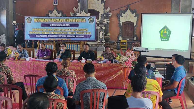 Telah dilaksanakan kegiatan musyawarah perencanaan pembangunan desa ( MUSRENBANGDES ) di Desa Pulukan, Kecamatan, Pekutatan, Kabupaten Jembrana, Provinsi Bali dalam rangka membahas dan menyepakati rancangan kerja pemerintahan desa tahun 2023.