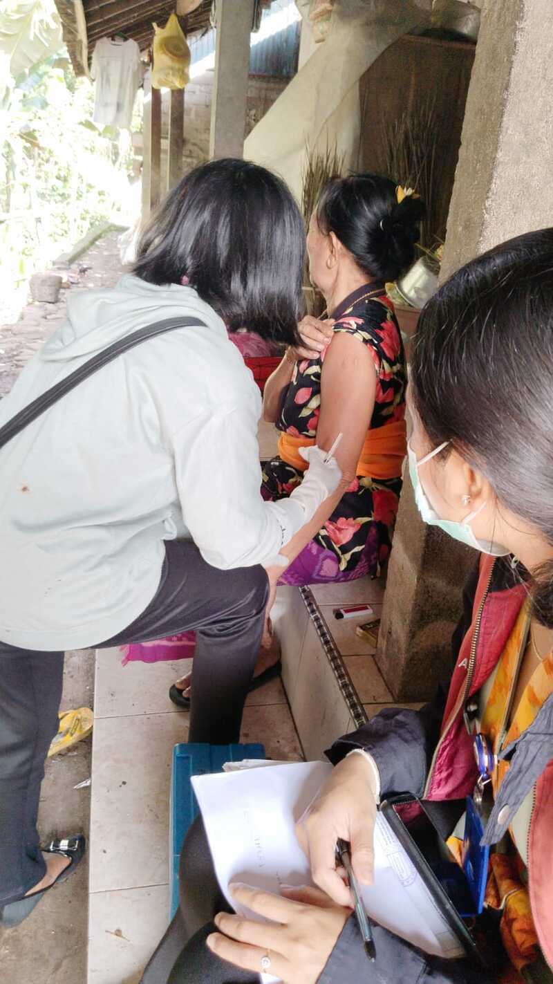 Di Banjar Pangkung Medahan, Petugas Kesehatan dari Puskesmas Kecamatan Pekutatan ( Dewa Ayu Dharma Prawerti) dan Petugas Kesehatan dari Puskemas Pembantu Desa Pulukan ( Gusti Ayu Nita Rastiti dan Adhe Desiyanti ) sedang melaksanakan program vaksinasi booster ke-2 untuk lansia (17/1/2023). Program ini merupakan upaya untuk meningkatkan tingkat imunitas masyarakat lansia yang lebih rentan terhadap infeksi virus COVID-19.