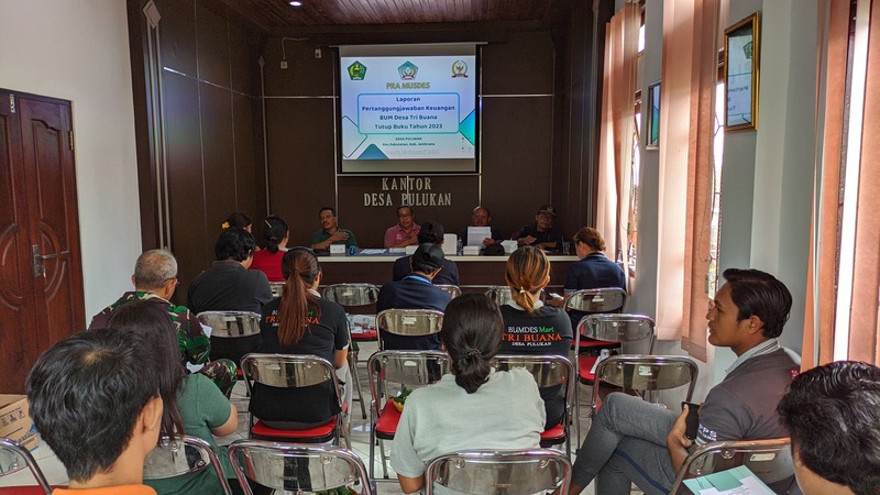 *Pulukan, 19 Januari 2024* - Ruang rapat Kantor Perbekel Pulukan menjadi saksi ketegangan dan antusiasme pada Pra Musyawarah Desa (MusDes) yang digelar hari ini. Acara tersebut dipusatkan pada penyampaian Laporan Pertanggungjawaban Keuangan BUM Desa Tri Buana Tutup Buku Tahun 2023. Turut hadir dalam pertemuan ini BPD Pulukan, Pemerintah Desa Pulukan, serta karyawan dan staf BUMDes.