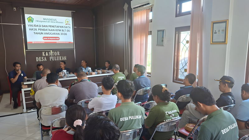 Pulukan - Pada tanggal 21 Nopember 2025, BPD Desa Pulukan menggelar Musyawarah Desa (Musdes) Khusus yang bertujuan untuk melakukan validasi dan penetapan data hasil pendataan Keluarga Penerima Manfaat (KPM) BLT-DD Tahun Anggaran 2026. Kegiatan penting ini diselenggarakan di Ruang Rapat Kantor Perbekel Pulukan dan dihadiri oleh berbagai pihak terkait. Dalam acara yang dipimpin oleh Ketua BPD Pulukan, Suherman, hadir Perwakilan Camat Pekutatan selaku Sekretaris Kecamatan Pekutatan, I Wayan Ali Subena Adi Saputra, S.Sos, MM., Perbekel Pulukan I Wayan Armawa, Kasi Pelayanan Desa Pulukan Tri Suherdaya, serta wakil dari Bhabinkabtimas, Bhabinsa, seluruh perangkat desa Pulukan, dan anggota BPD Desa Pulukan.