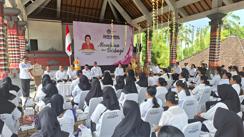 Ny. Putri Suastini Koster, Ketua Tim Pembina Posyandu Provinsi Bali, bersama Ketua TP PKK Kabupaten Jembrana, Ny. drg. Ani Setiawarini Kembang Hartawan, menggelar aksi sosial "Membina dan Berbagi" di Desa Pulukan dan Medewi, Kecamatan Pekutatan, Senin (9/3/2026). Kegiatan ini dihadiri oleh jajaran perangkat daerah Provinsi Bali dan Kabupaten Jembrana, camat, perbekel, serta para kader Posyandu setempat.